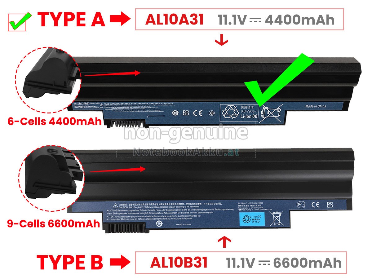 2 Vergleichen Sie die Spannung und das Fassungsvermögen Ihrer Akku für Gateway LT2704E mit unserer, dann schauen Sie das Bild und prüfen Sie, ob die Schittstelle und Form der neuen Akku gleich mit der alten Batterie ist.