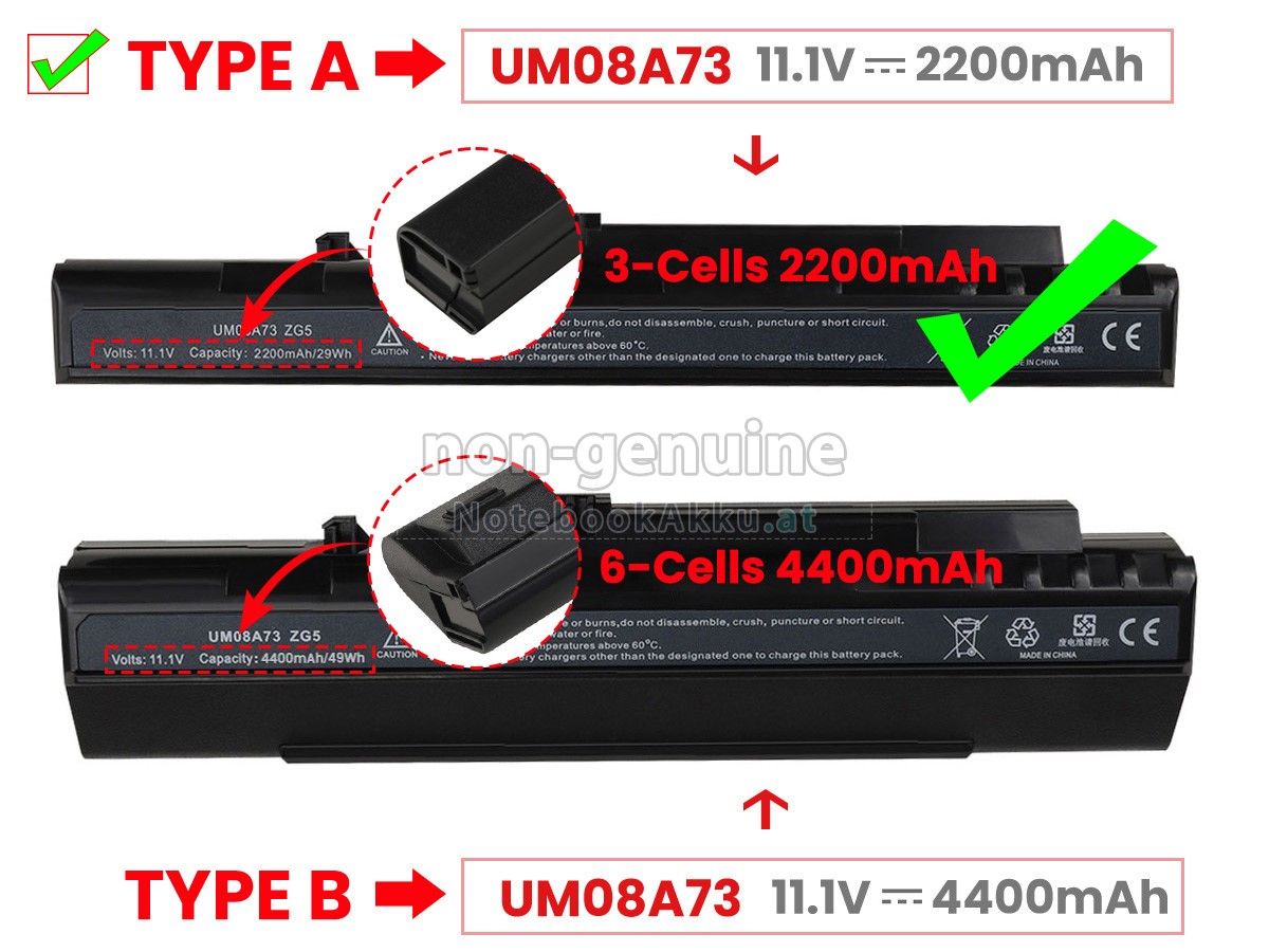 2 Vergleichen Sie die Spannung und das Fassungsvermögen Ihrer Akku für Acer UM08A74 mit unserer, dann schauen Sie das Bild und prüfen Sie, ob die Schittstelle und Form der neuen Akku gleich mit der alten Batterie ist.