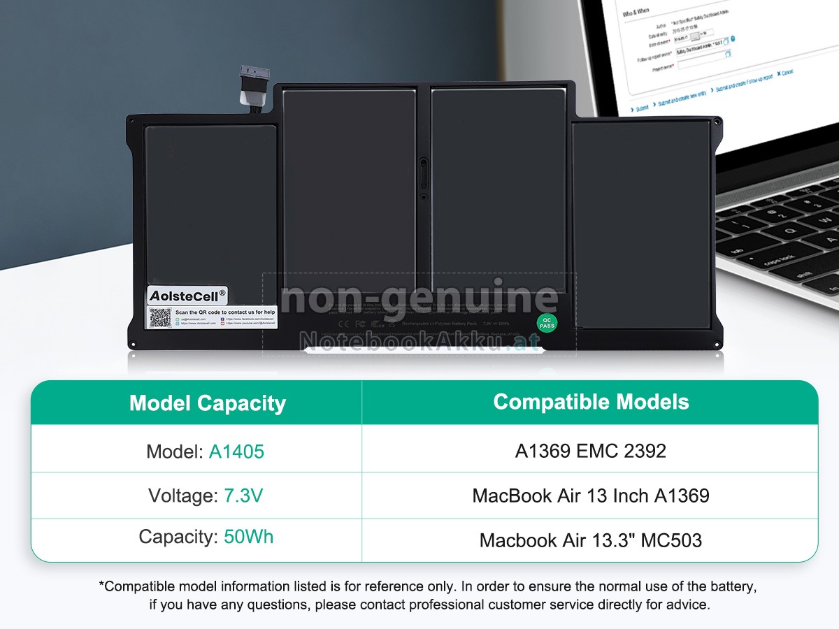 2 Vergleichen Sie die Spannung und das Fassungsvermögen Ihrer Akku für Apple MacBook Air Core 2 DUO 1.86GHZ 13 inch A1369(EMC 2392) mit unserer, dann schauen Sie das Bild und prüfen Sie, ob die Schittstelle und Form der neuen Akku gleich mit der alten Batterie ist.