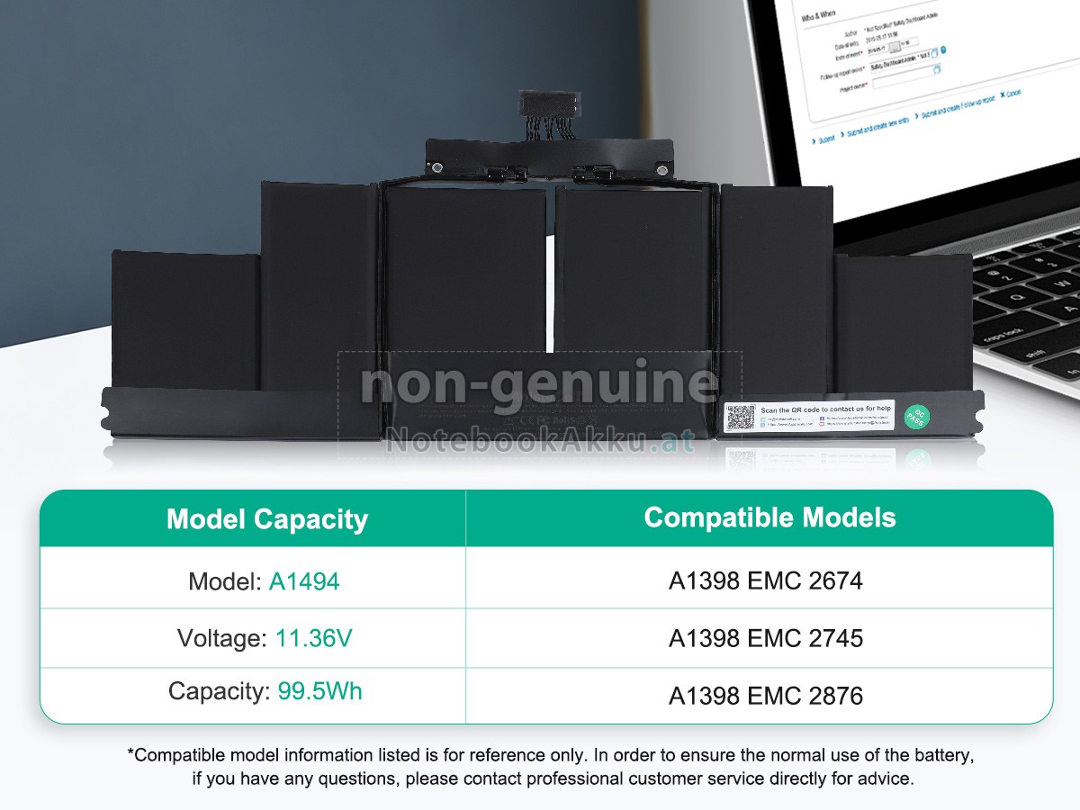 Ersatzakku für Apple MacBook Pro Core I7 2.5GHZ 15.4 inch Retina A1398(EMC 2881) (99.5Wh, 6 Zellen)