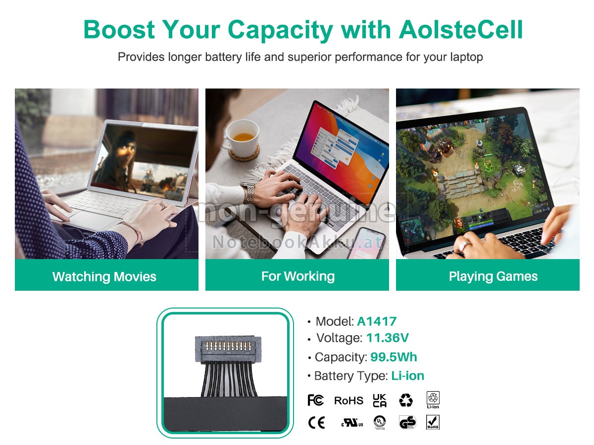Ersatzakku für Apple MD831LL/A in der Webseite NotebookAkku.at zählt zu besten Wahlen. Wir bieten Ihnen mit günstigerem Preis die hochwertigere Akku des Notebooks. Apple MD831LL/A Akku, der aus hochwertigem Li-Polymer von Samsung, Panasonic und LG hergestellt wird, kann für mindestens 600 Zyklen aufgeladen / entladen werden, was Ihnen ein hervorragendes Erlebnis zur anhaltenden Verwendung bietet.