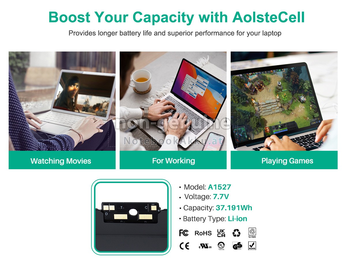 Ersatzakku für Apple mmGM2LL/A in der Webseite NotebookAkku.at zählt zu besten Wahlen. Wir bieten Ihnen mit günstigerem Preis die hochwertigere Akku des Notebooks. Apple mmGM2LL/A Akku, der aus hochwertigem Li-Polymer von Samsung, Panasonic und LG hergestellt wird, kann für mindestens 600 Zyklen aufgeladen / entladen werden, was Ihnen ein hervorragendes Erlebnis zur anhaltenden Verwendung bietet.