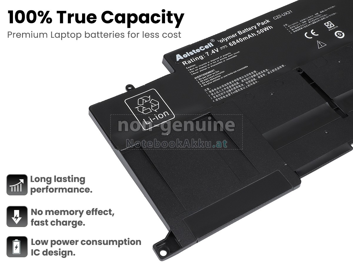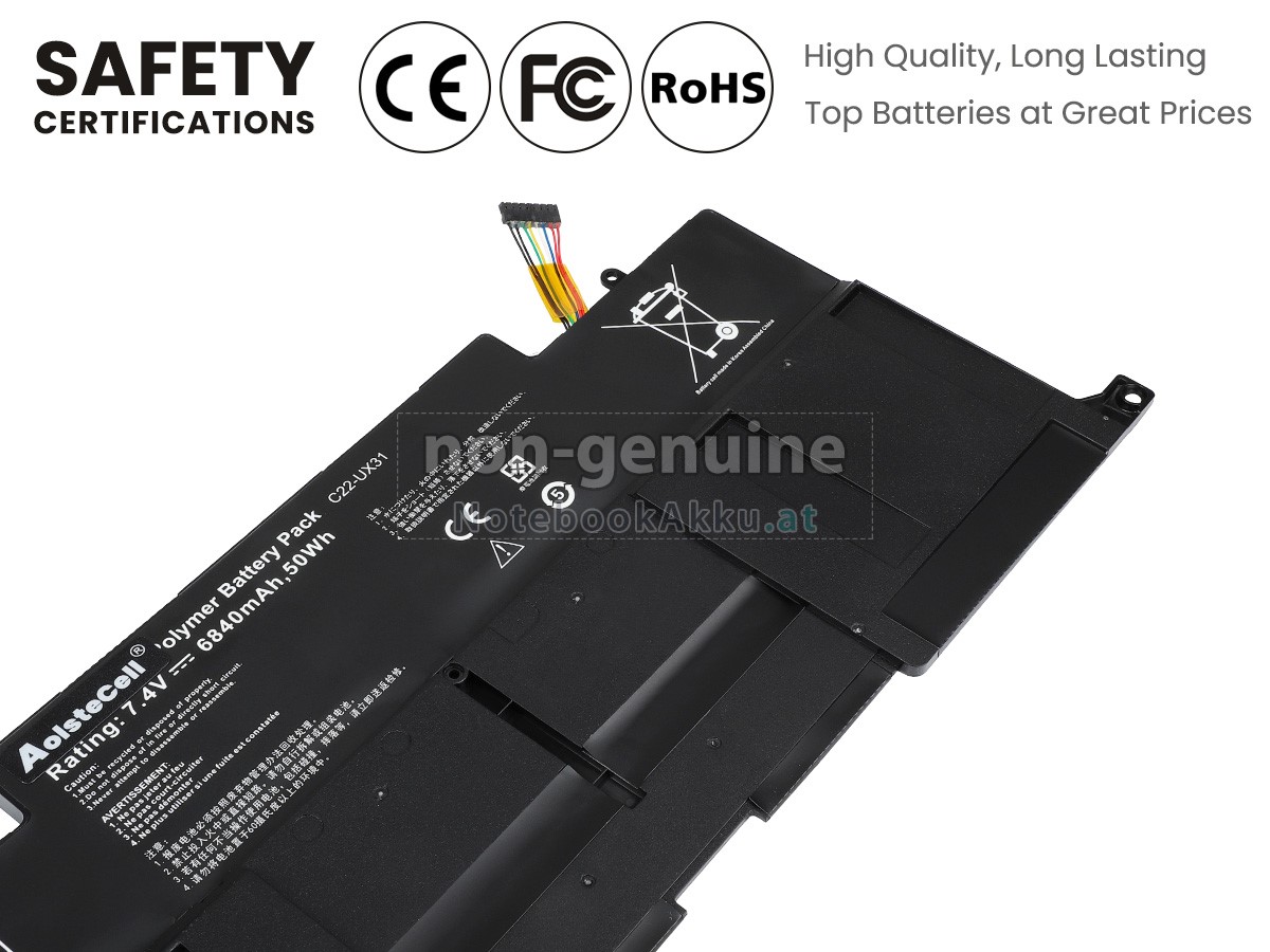 Ersatzakku für Asus C22-UX31 in der Webseite NotebookAkku.at zählt zu besten Wahlen. Wir bieten Ihnen mit günstigerem Preis die hochwertigere Akku des Notebooks. Asus C22-UX31 Akku, der aus hochwertigem Li-Polymer von Samsung, Panasonic und LG hergestellt wird, kann für mindestens 600 Zyklen aufgeladen / entladen werden, was Ihnen ein hervorragendes Erlebnis zur anhaltenden Verwendung bietet.