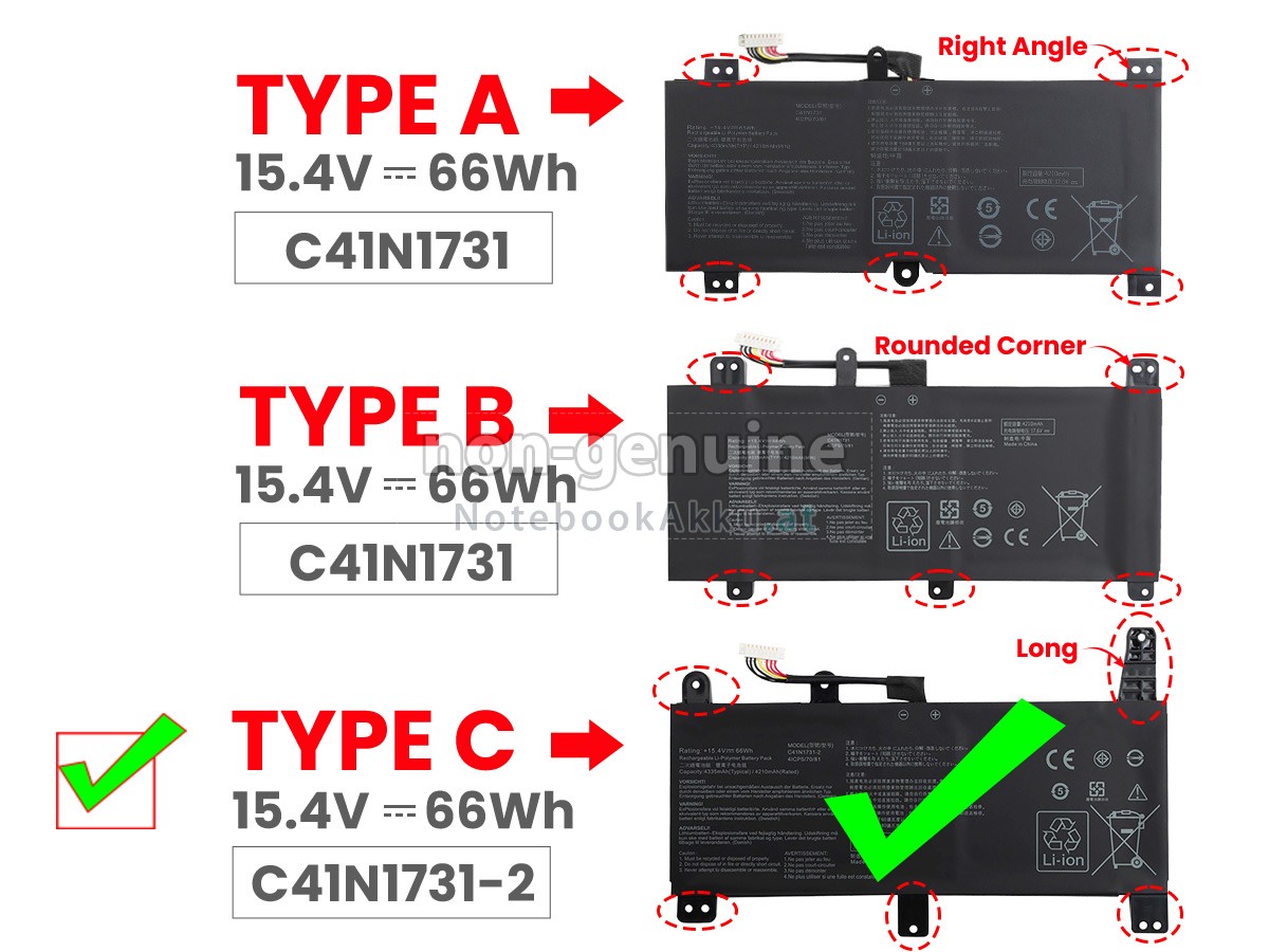 2 Vergleichen Sie die Spannung und das Fassungsvermögen Ihrer Akku für Asus Rog STRIX G G731GW-EV124T mit unserer, dann schauen Sie das Bild und prüfen Sie, ob die Schittstelle und Form der neuen Akku gleich mit der alten Batterie ist.