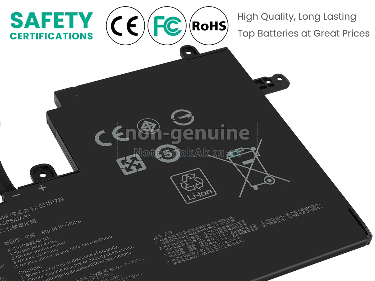 Jede unserer Akkus für Asus VivoBook S530UF-BQ185T ist vollständig kompatibel mit dem Originalhersteller. Außerdem besteht sie eine Serie Sicherheitszertifikaten wie OVE,CE,UL,ROHS,ISO9001 / 9002. Vor dem Warenausgang überprüfen unsere Techniker sie streng, um Ihre Sicherheit so viel wie möglich zu garantieren. Vor der Versendung hüllen wir VivoBook S530UF-BQ185T-Batterie mit einigen Schichten Luftpolsterfolien ein, um die Verletzung bei der Lieferung zu vermeiden.