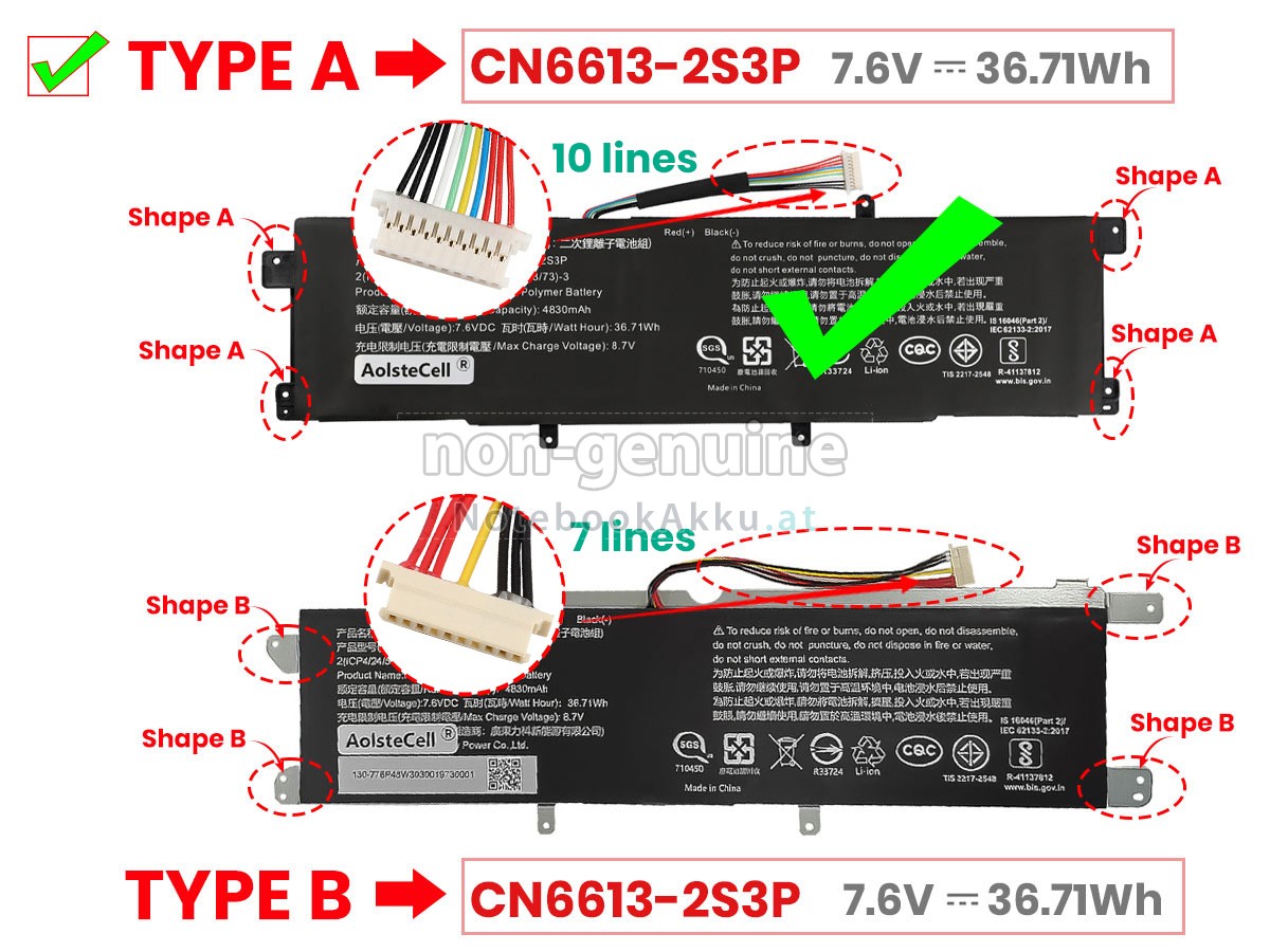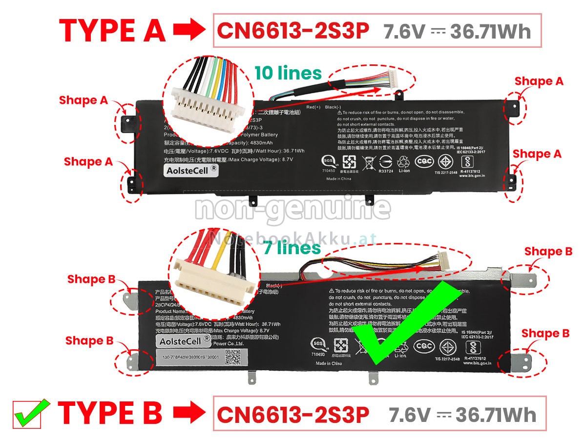 2 Vergleichen Sie die Spannung und das Fassungsvermögen Ihrer Akku für Avita NS13A2 mit unserer, dann schauen Sie das Bild und prüfen Sie, ob die Schittstelle und Form der neuen Akku gleich mit der alten Batterie ist.