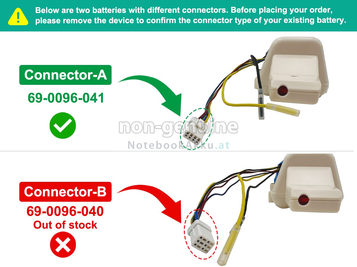 2 Vergleichen Sie die Spannung und das Fassungsvermögen Ihrer Akku für Bissell 69-0096-041 mit unserer, dann schauen Sie das Bild und prüfen Sie, ob die Schittstelle und Form der neuen Akku gleich mit der alten Batterie ist.