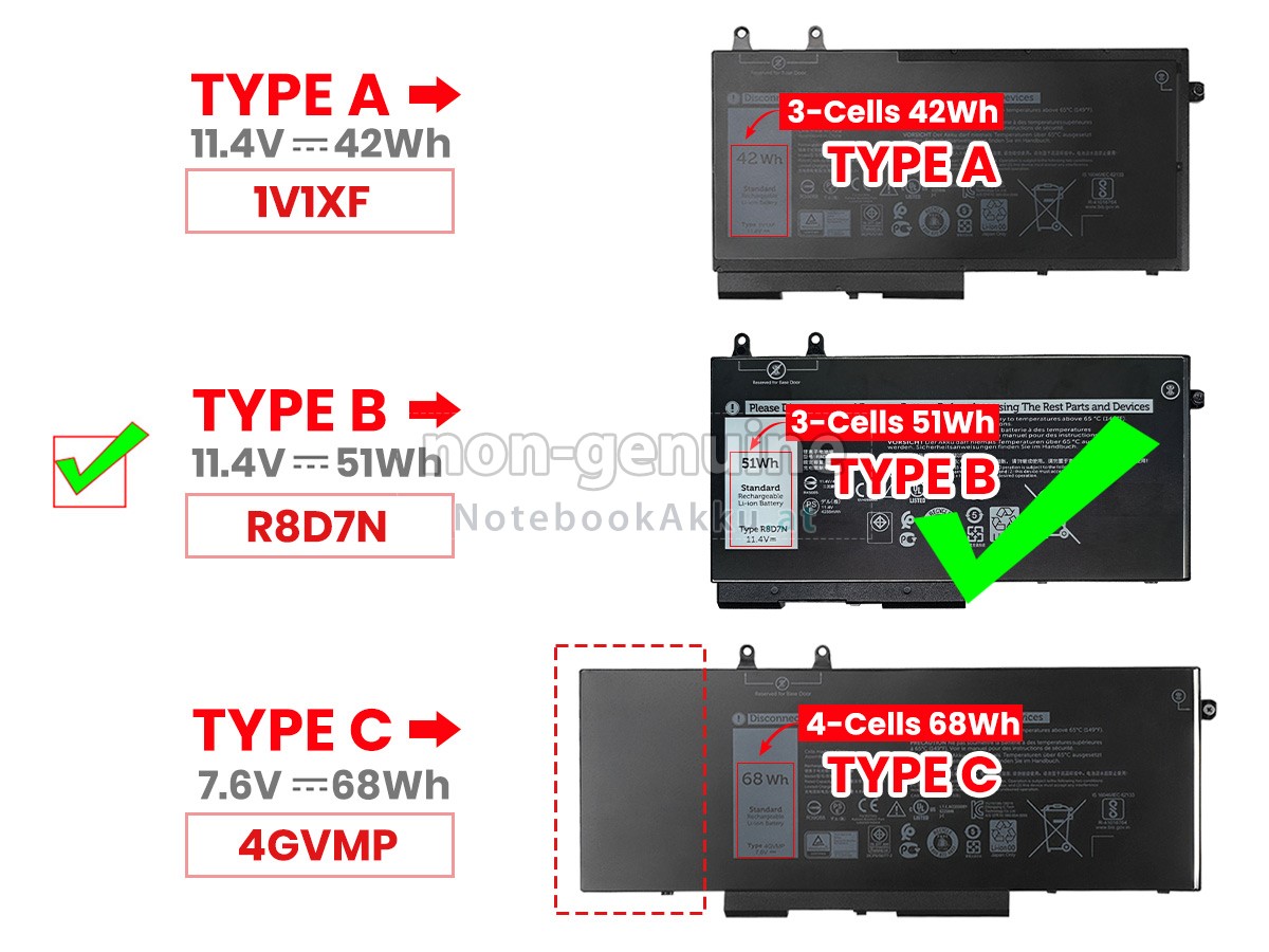 2 Vergleichen Sie die Spannung und das Fassungsvermögen Ihrer Akku für Dell Latitude 5500 mit unserer, dann schauen Sie das Bild und prüfen Sie, ob die Schittstelle und Form der neuen Akku gleich mit der alten Batterie ist.