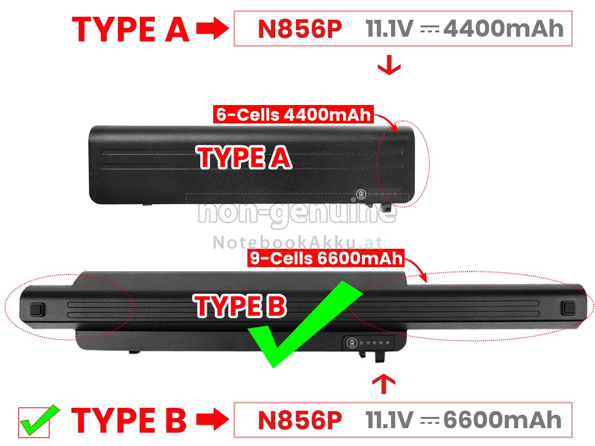 2 Vergleichen Sie die Spannung und das Fassungsvermögen Ihrer Akku für Dell N856P mit unserer, dann schauen Sie das Bild und prüfen Sie, ob die Schittstelle und Form der neuen Akku gleich mit der alten Batterie ist.