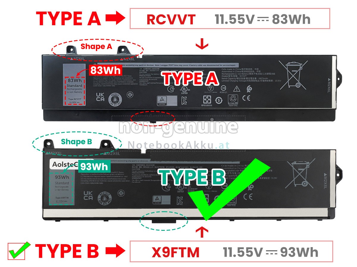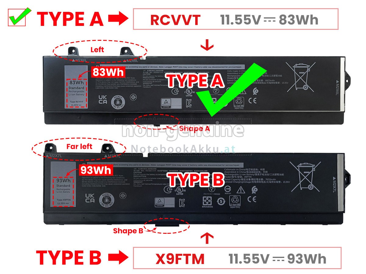 2 Vergleichen Sie die Spannung und das Fassungsvermögen Ihrer Akku für Dell Precision 7780 mit unserer, dann schauen Sie das Bild und prüfen Sie, ob die Schittstelle und Form der neuen Akku gleich mit der alten Batterie ist.