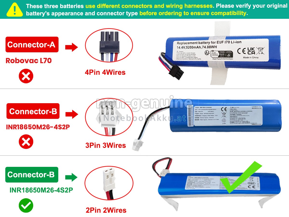 2 Vergleichen Sie die Spannung und das Fassungsvermögen Ihrer Akku für Eufy INR18650M26-4S2P mit unserer, dann schauen Sie das Bild und prüfen Sie, ob die Schittstelle und Form der neuen Akku gleich mit der alten Batterie ist.