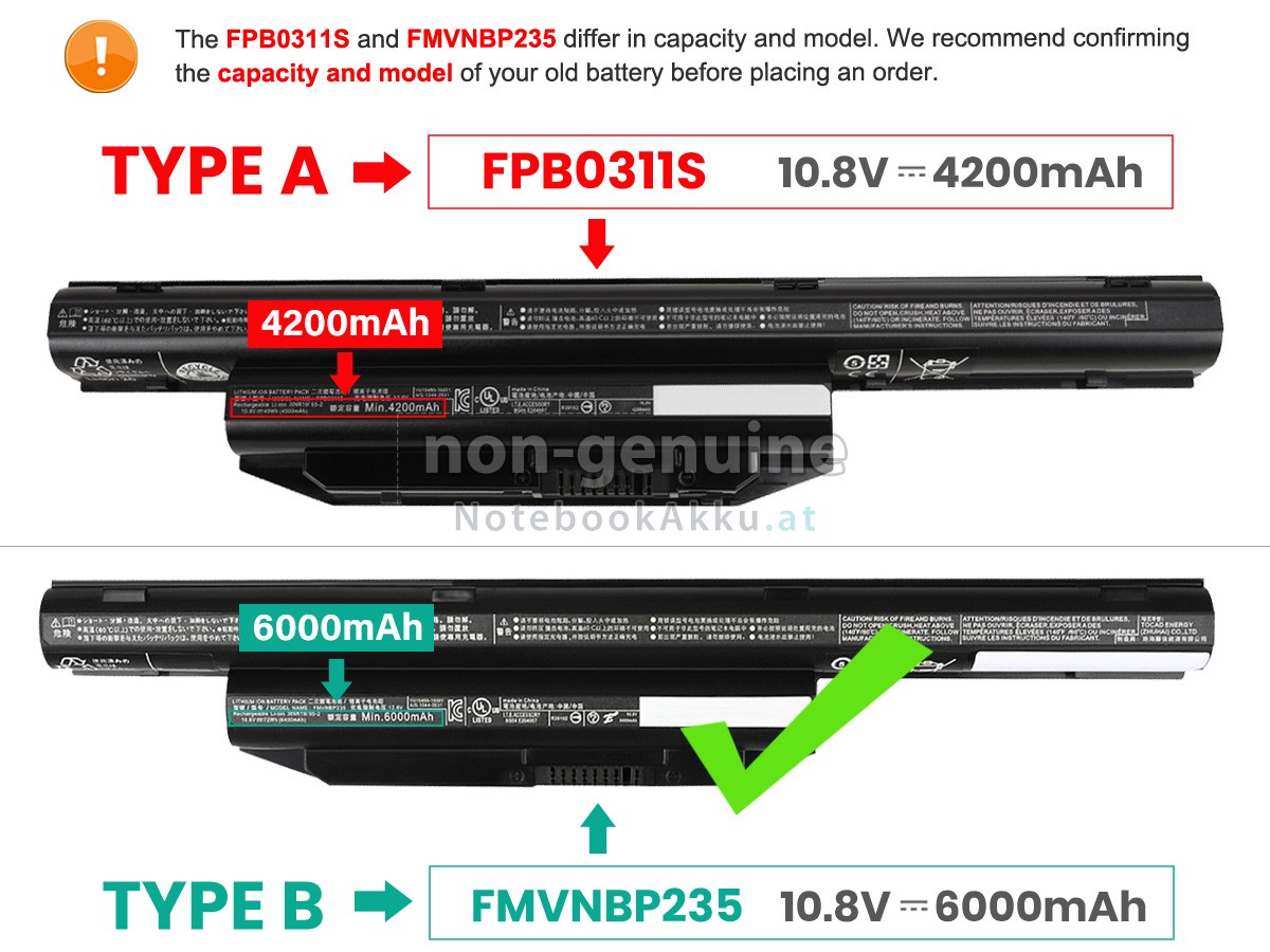 2 Vergleichen Sie die Spannung und das Fassungsvermögen Ihrer Akku für Fujitsu FPCBP404 mit unserer, dann schauen Sie das Bild und prüfen Sie, ob die Schittstelle und Form der neuen Akku gleich mit der alten Batterie ist.