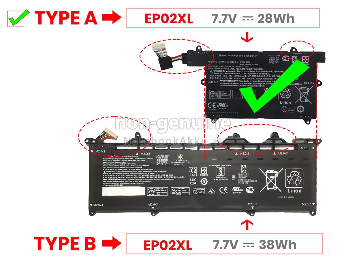 2 Vergleichen Sie die Spannung und das Fassungsvermögen Ihrer Akku für HP EP02038XL mit unserer, dann schauen Sie das Bild und prüfen Sie, ob die Schittstelle und Form der neuen Akku gleich mit der alten Batterie ist.