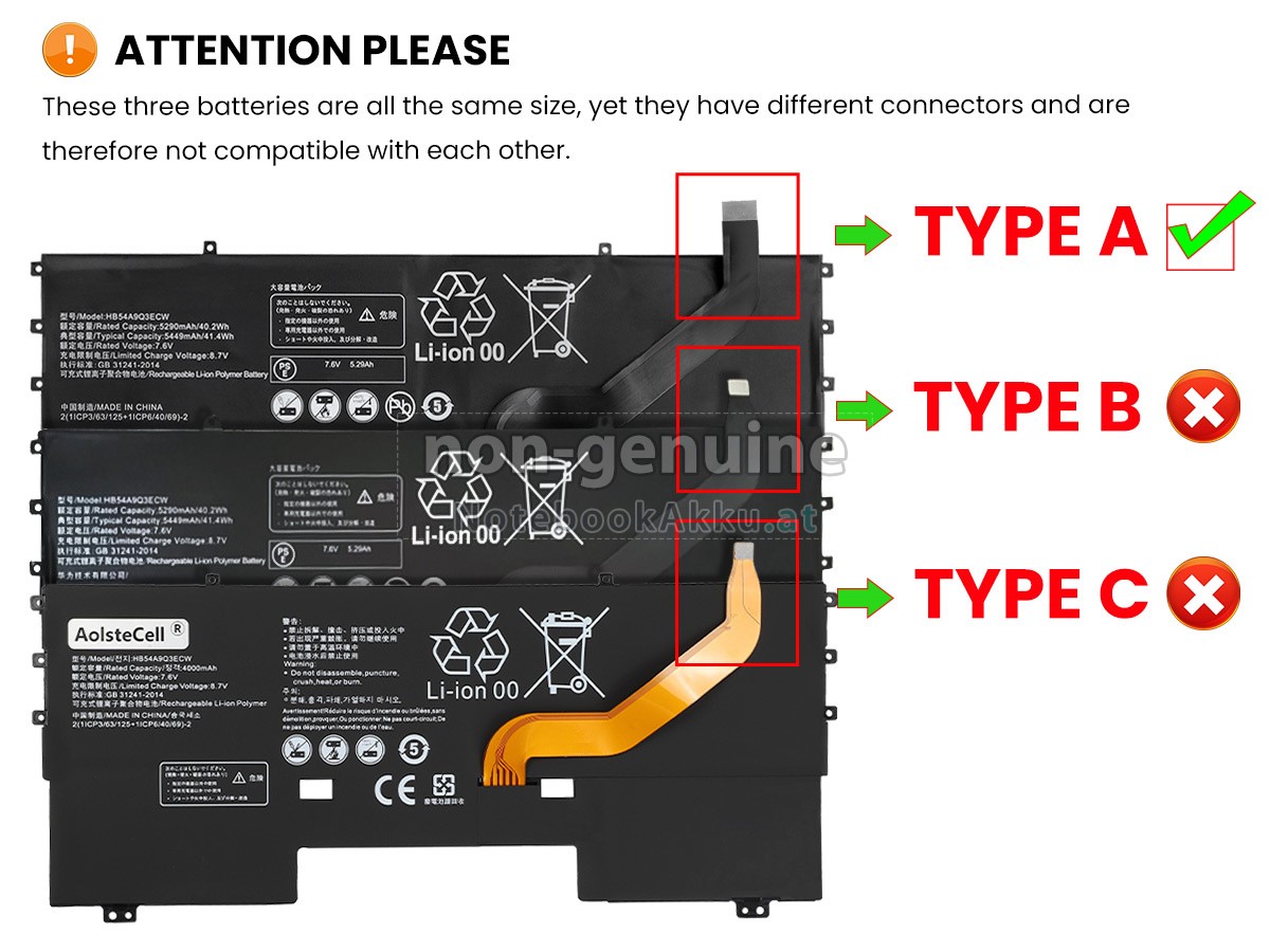 There are 3 types battery named "HB54A9Q3ECW", before placing an order please check your old battery first, ensure the connector is same to our battery Type A.