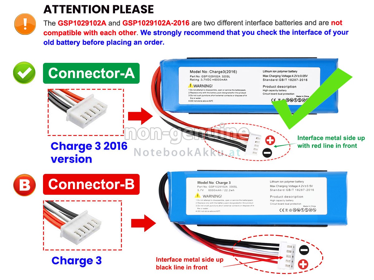 2 Vergleichen Sie die Spannung und das Fassungsvermögen Ihrer Akku für JBL GSP1029102A-2016 mit unserer, dann schauen Sie das Bild und prüfen Sie, ob die Schittstelle und Form der neuen Akku gleich mit der alten Batterie ist.