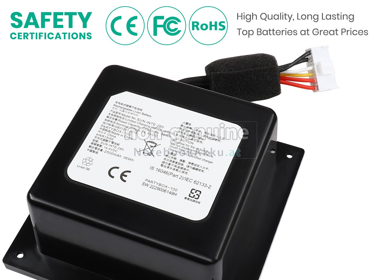 Ersatzakku für JBL PARTYBOX 100 in der Webseite NotebookAkku.at zählt zu besten Wahlen. Wir bieten Ihnen mit günstigerem Preis die hochwertigere Akku des Lautsprecher. JBL PARTYBOX 100 Akku, der aus hochwertigem Li-ion von Samsung, Panasonic und LG hergestellt wird, kann für mindestens 600 Zyklen aufgeladen / entladen werden, was Ihnen ein hervorragendes Erlebnis zur anhaltenden Verwendung bietet.