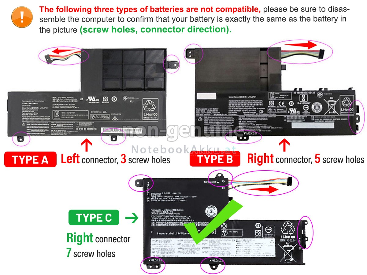 2 Vergleichen Sie die Spannung und das Fassungsvermögen Ihrer Akku für Lenovo IdeaPad 720-15IKB 81C7 mit unserer, dann schauen Sie das Bild und prüfen Sie, ob die Schittstelle und Form der neuen Akku gleich mit der alten Batterie ist.