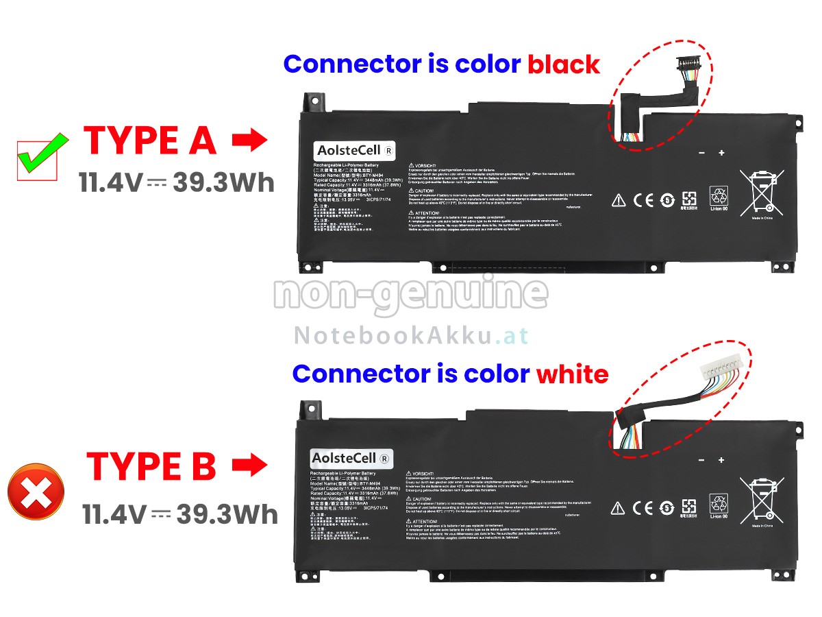 2 Vergleichen Sie die Spannung und das Fassungsvermögen Ihrer Akku für MSI MODERN 15 A11MU-652 mit unserer, dann schauen Sie das Bild und prüfen Sie, ob die Schittstelle und Form der neuen Akku gleich mit der alten Batterie ist.