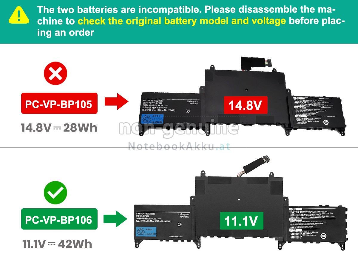 2 Vergleichen Sie die Spannung und das Fassungsvermögen Ihrer Akku für NEC GL186Y/3Z mit unserer, dann schauen Sie das Bild und prüfen Sie, ob die Schittstelle und Form der neuen Akku gleich mit der alten Batterie ist.