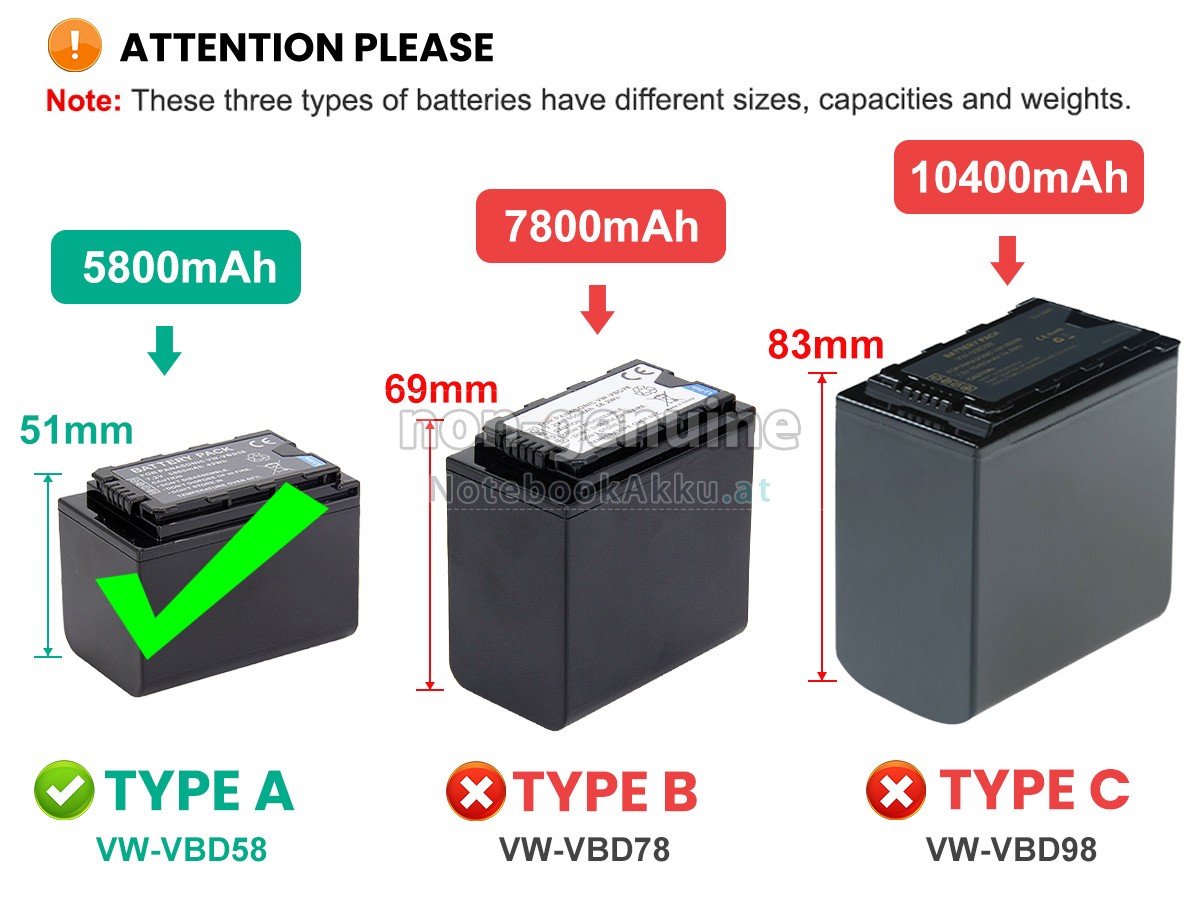 Ersatzakku für Panasonic VW-VBD58 in der Webseite NotebookAkku.at zählt zu besten Wahlen. Wir bieten Ihnen mit günstigerem Preis die hochwertigere Akku. Panasonic VW-VBD58 Akku, der aus hochwertigem Li-ion von Samsung, Panasonic und LG hergestellt wird, kann für mindestens 600 Zyklen aufgeladen / entladen werden, was Ihnen ein hervorragendes Erlebnis zur anhaltenden Verwendung bietet.