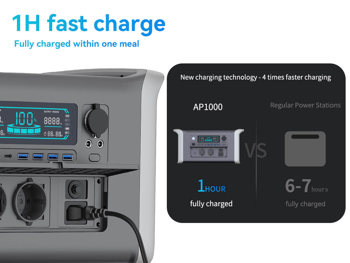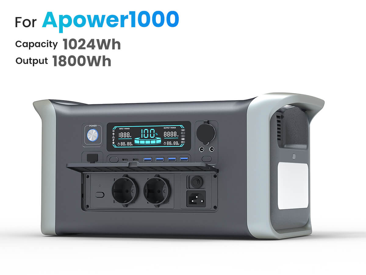 Unsere tragbare Energiestation Apower1000 ist mit einer leistungsstarken 1024Wh-LiFePO4-Batterie ausgestattet. Diese leistungsstarke Batterie ist für ihre Langlebigkeit und Sicherheit bekannt und stellt sicher, dass Sie eine zuverlässige Energiequelle für alle Ihre Outdoor-Abenteuer haben. Egal, ob Sie campen, mit dem Wohnmobil unterwegs sind oder eine Notstromversorgung benötigen, mit dieser Power Station sind Sie bestens versorgt.