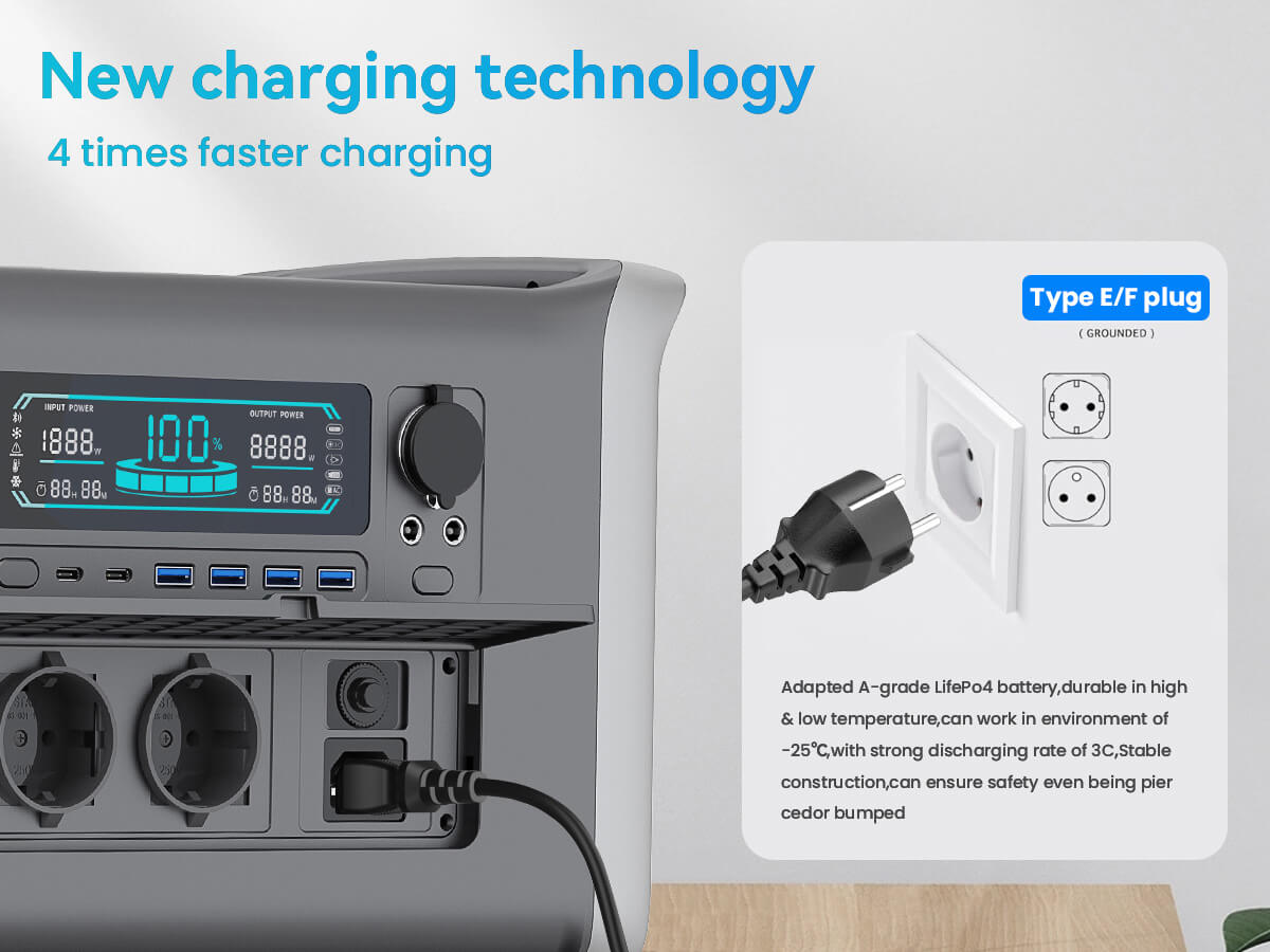 A: Die Dauer der Stromversorgung mit einer vollen Ladung hängt von der Leistungsaufnahme der angeschlossenen Geräte ab. So kann sie beispielsweise einen 60-W-Laptop etwa 17 Stunden lang mit Strom versorgen, eine 10-W-LED-Lampe etwa 102 Stunden lang oder einen 100-W-Mini-Kühlschrank etwa 10 Stunden lang. Diese Schätzungen können je nach den spezifischen Geräten und ihrem Nutzungsverhalten variieren. Mit der neuen Generation der Schnellladetechnologie können Sie die Power Station in nur einer Stunde vollständig aufladen, so dass Sie mehr Zeit haben, Ihre Abenteuer zu genießen, und weniger Zeit mit dem Warten auf eine Aufladung verbringen müssen.