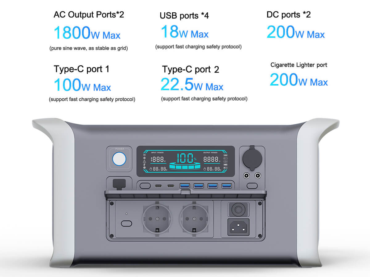 A: Die Energiestation verfügt über mehrere Ausgangsoptionen, um eine breite Palette von Geräten gleichzeitig zu unterstützen. Sie verfügt über einen AC-Ausgang von 1800W (220V) oder 1600W (110V), einen DC-Ausgang mit einem Anschluss für den Zigarettenanzünder im Auto, der bis zu 200W unterstützt, zwei Typ-C-Anschlüsse und vier USB-Anschlüsse. Mit dieser Konfiguration können Sie Laptops, Smartphones, Kameras, kleine Geräte wie Mini-Kühlschränke und sogar einige Elektrowerkzeuge mit Strom versorgen. Stellen Sie sicher, dass die Gesamtwattzahl der angeschlossenen Geräte die maximale Ausgangskapazität nicht überschreitet, um eine Überlastung zu vermeiden.