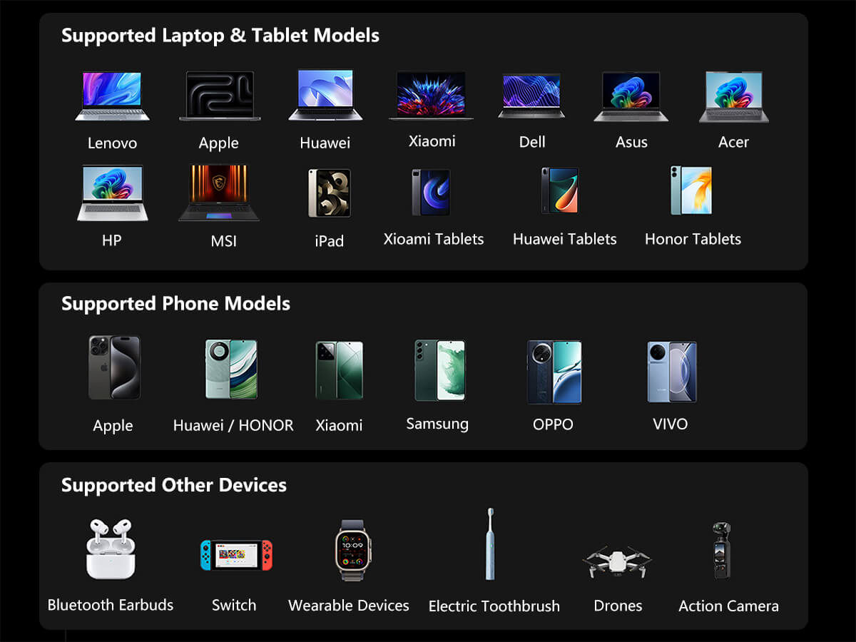 Ein digitales Ladezustandsdisplay sorgt jederzeit für Übersicht über die verbleibende Energie. Neben klassischen Endgeräten eignet sich die Powerbank auch zum Laden von Smartwatches, Bluetooth-Kopfhörern, Drohnen, Action-Kameras und tragbaren Spielkonsolen. Dank bestandener UN38.3-Prüfung sowie CE-, FCC- und RoHS-Zertifizierung ist sie für Flugreisen geeignet und erfüllt internationale Sicherheitsanforderungen.