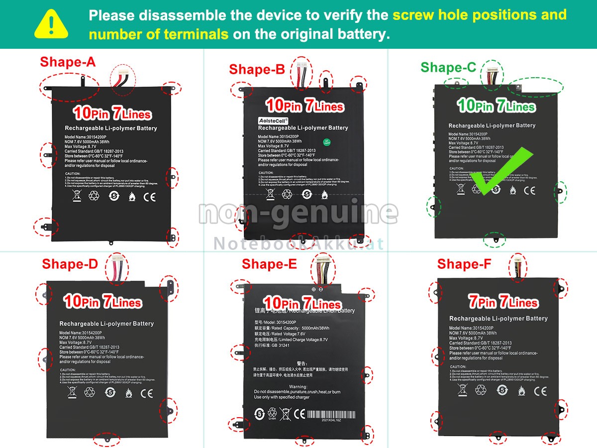 2 Vergleichen Sie die Spannung und das Fassungsvermögen Ihrer Akku für Teclast F7 PRO mit unserer, dann schauen Sie das Bild und prüfen Sie, ob die Schittstelle und Form der neuen Akku gleich mit der alten Batterie ist.