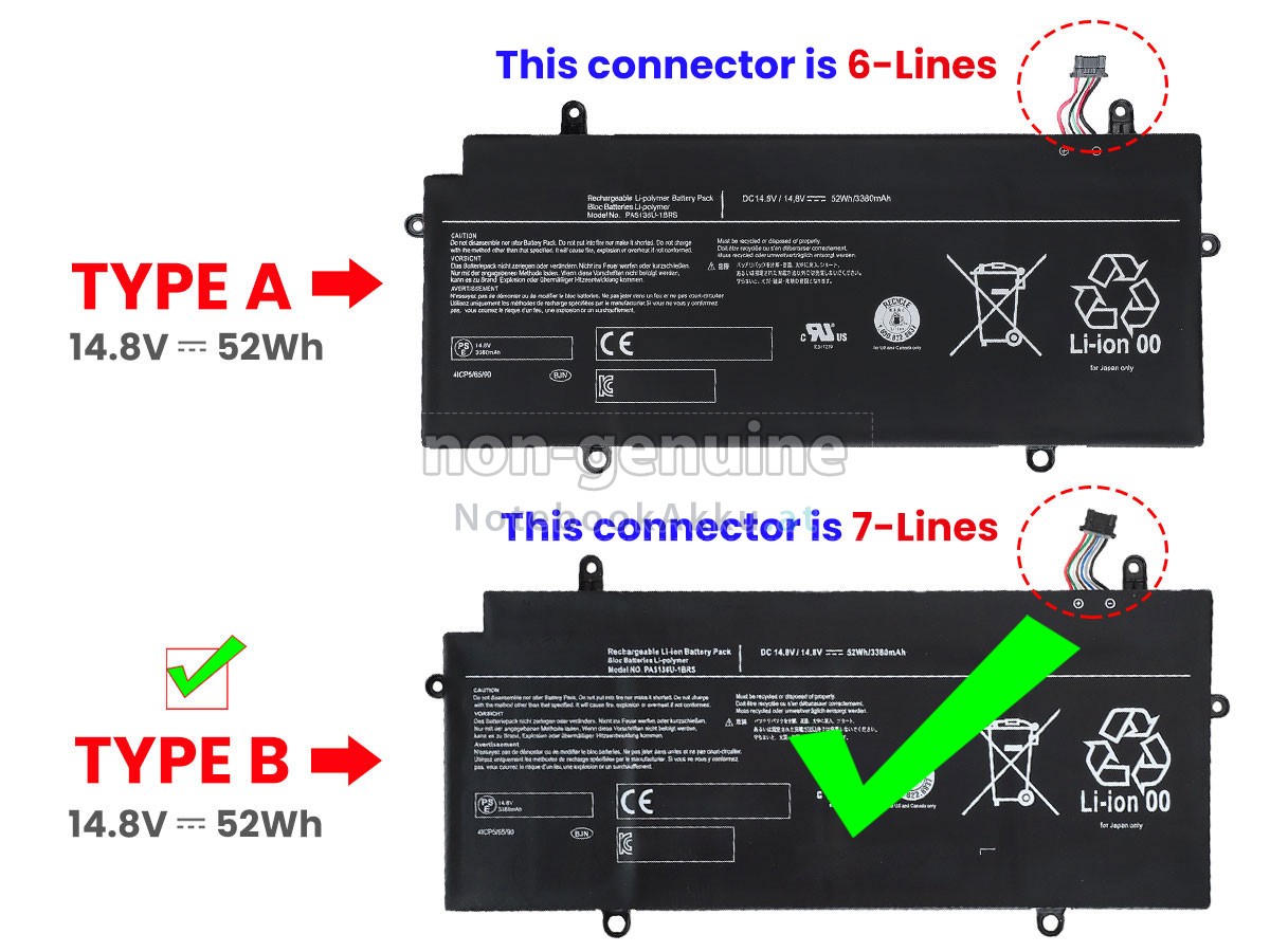 2 Vergleichen Sie die Spannung und das Fassungsvermögen Ihrer Akku für Toshiba Satellite Z30-B mit unserer, dann schauen Sie das Bild und prüfen Sie, ob die Schittstelle und Form der neuen Akku gleich mit der alten Batterie ist.
