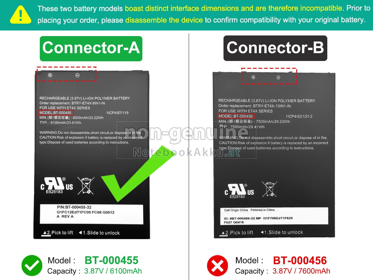 2 Vergleichen Sie die Spannung und das Fassungsvermögen Ihrer Akku für Zebra ET45HC mit unserer, dann schauen Sie das Bild und prüfen Sie, ob die Schittstelle und Form der neuen Akku gleich mit der alten Batterie ist.
